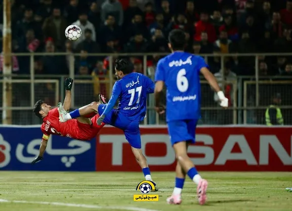 شجاع خلیلزاده قصد داشت با ضربه قیچی برگردان دروازه تیم استقلال خوزستان را باز کند.