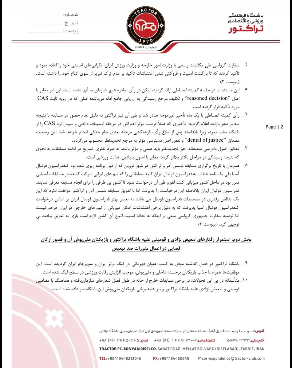 به نقل از خبرورزشی؛ شکایت تراکتور که با امضای اعضای هیأتمدیره باشگاه تنظیم و ثبت شده، شامل محورهای زیر است: