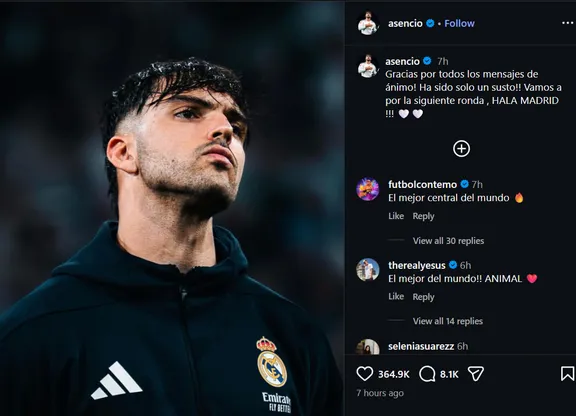 باشگاه هنوز گزارش رسمی درباره وضعیت پزشکی این بازیکن منتشر نکرده است. با این حال، آسنسیو چند ساعت پس از حادثه در شبکههای اجتماعی پیامی آرامشبخش منتشر کرد: «از همه برای پیامهای حمایتی متشکرم! فقط یک ترس بود. برای مرحله بعدی میجنگیم. زنده باد مادرید!»