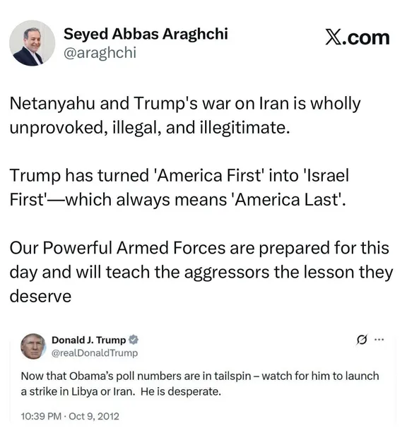وزیر خارجۀ ایران با یادآوری تصویری از توئیت ترامپ در سال ۲۰۱۲ که نوشته بود «حالا که محبوبیت اوباما بهشدت در حال سقوط است، منتظر باشید که او حملهای به لیبی یا ایران انجام دهد» نوشت: جنگِ نتانیاهو و ترامپ علیه ایران کاملاً بیدلیل، غیرقانونی و نامشروع است.