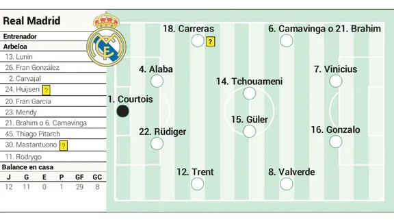 در سایر پستها تغییر بزرگی پیشبینی نمیشود، بنابراین رئال احتمالاً با این ترکیب به میدان میرود: کورتوا؛ ترنت الکساندر آرنولد، رودیگر، آلابا، کارراس؛ والورده، گولر، شوامنی، براهیم؛ وینیسیوس و گونزالو.