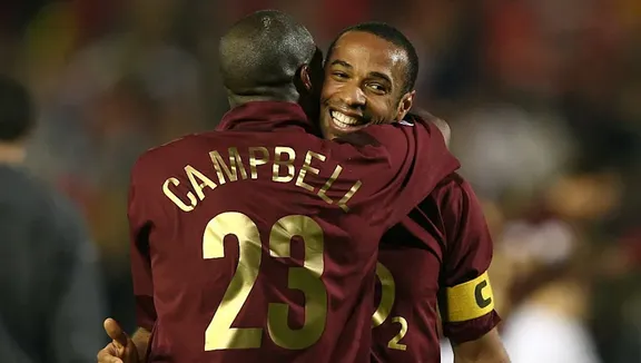 تصویر نوستالژیک از آغوش گرم تیری آنری و سول کمپبل با لباس عنابی‌رنگ خاطره‌انگیز آرسنال در فصل ۲۰۰۶-۲۰۰۵؛ جشن و شادی دو اسطوره توپچی‌های لندن در ورزشگاه هایبوری.