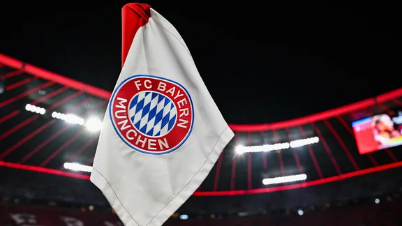 لوگوی باشگاه فوتبال بایرن مونیخ روی پرچم سفید در اتمسفر شبانه ورزشگاه آلیانتس آرنا