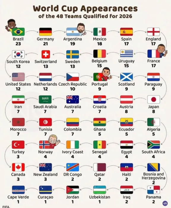 تنها تیمی که در تمام دوره های جام جهانی حضور داشته، برزیل با 23 بار است. برزیل در این مدت 5 بار هم به عنوان قهرمانی رسیده و رکورددار محسوب می‌شود. آلمان، آرژانتین، مکزیک، اسپانیا، انگلیس، فرانسه، اروگوئه و بلژیک هم 10 تیم پرسابقه هستند که در این رقابتها حضور دارند. جالب است بدانید که در رتبه بعدی نام سوئیس و سوئد با 13 حضور دیده می‌شود.